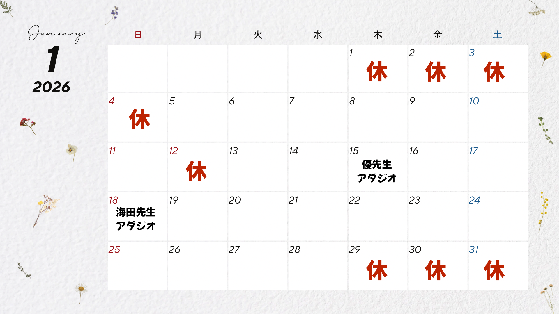 1月1・2・3・4日冬休み
