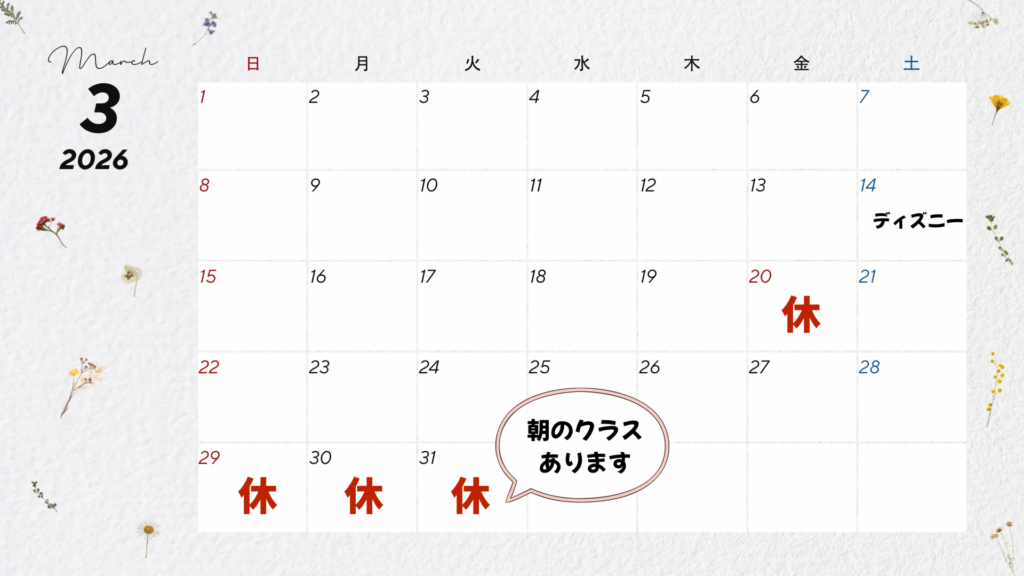 ※3月31日(火)は17日(火)の振替レッスンで朝のレッスンだけあります。