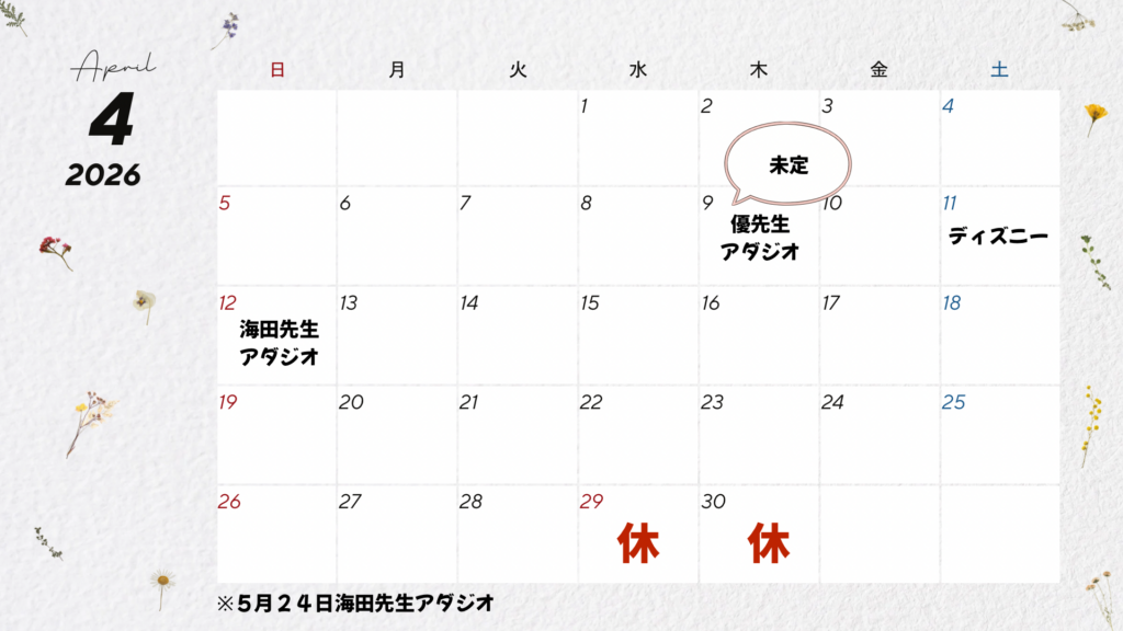 ※GW(4月29日〜5月6日)は5月1日・2日のレッスンはあります。4月29・30日は5週目、5月3日〜6日は祝日でお休みです。夏休みは10月に取る予定です。